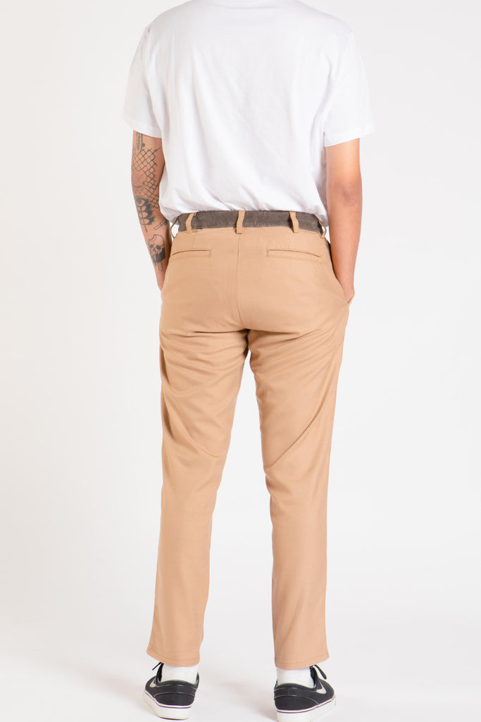 48% polyester, 47% viscose, & 5% elastin, camel-colored slim fit chino with brown corduroy waistband and belt loop.