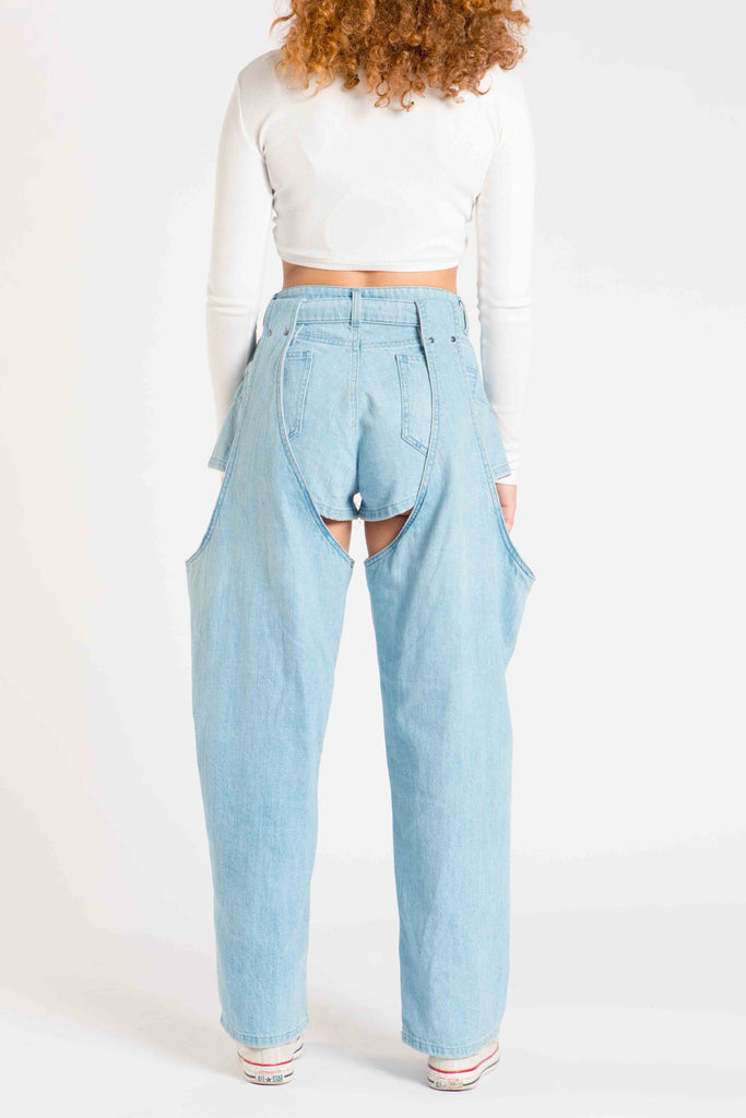 High waist, 100% Tencel-Denim short/pants in 'ice' wash. Hot shorts with removable leg panels attached to waist bad. Leg panels made to be loose-fit.