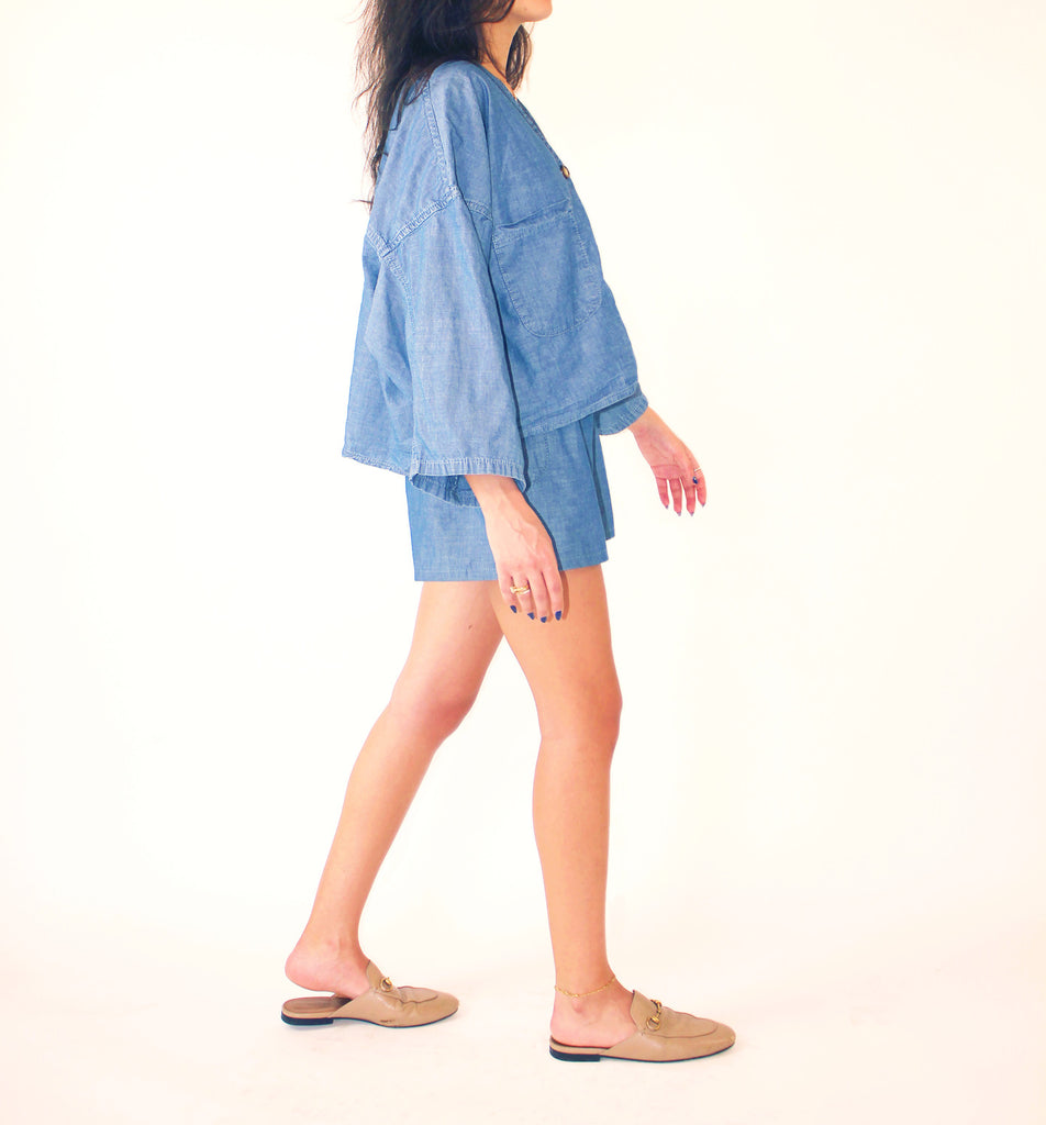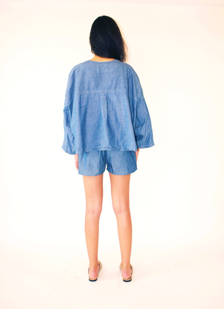 Blue, loose 100% cotton denim buttoned down shirt with linen construction.
