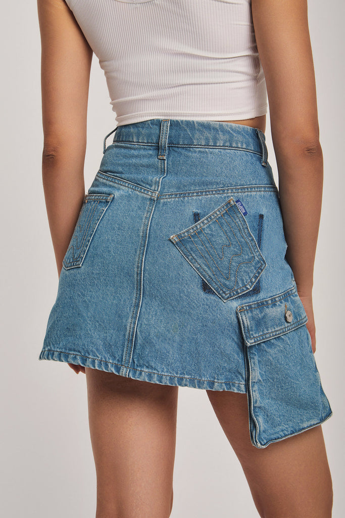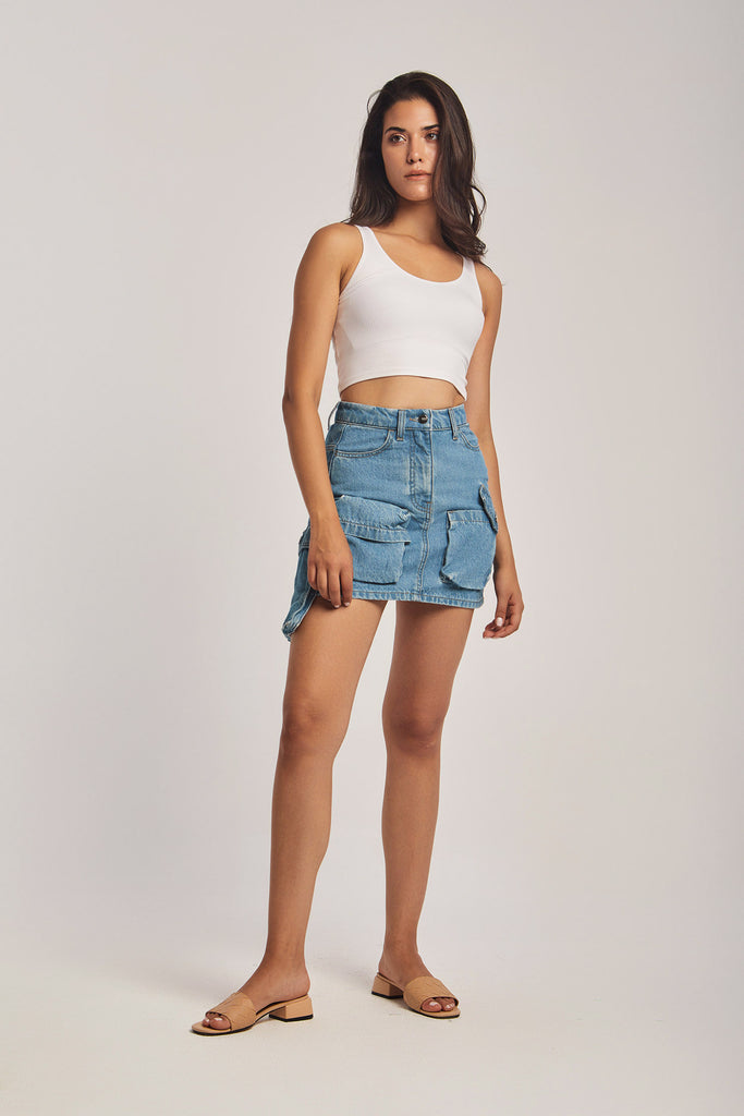 High-waist 100% Cotton denim cargo mini-skirt.